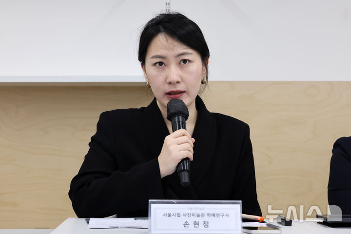 [서울=뉴시스] 박진희 기자 = 서울시립 사진미술관 손현정 학예연구사가 28일 서울 도봉구 서울시립 사진미술관에서 개관특별전 '광채 光彩 : 시작의 순간들' 전시 설명을 하고 있다. 서울시립 사진미술관은 우리나라 공립미술관 중 최초로 설립된 사진 매체 특화 미술관이다. 2025.05.28. [email protected]