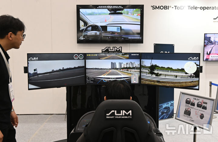 [수원=뉴시스] 김종택 기자 = 28일 경기 수원시 영통구 수원컨벤션센터에서 열린 '2025 수원 ITS 아태총회'에서 관람객이 원격주행 기술 체험을 하고 있다.