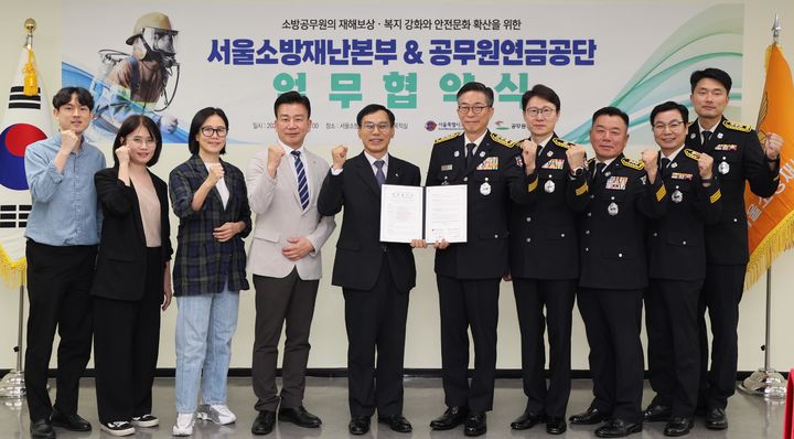 [서울=뉴시스] 권혁민 서울소방재난본부장이 28일 서울 중구 서울소방재난본부에서 이성희 공무원연금공단 재해예방보상본부장과 업무상 상해를 입은 전·현직 소방공무원에 대한 보상 및 교육 등 지원 강화를 위한 업무협약을 체결한 뒤 관계자들과 기념촬영 하고 있다. (사진=서울소방재난본부 제공) 2025.05.28. [email protected] *재판매 및 DB 금지