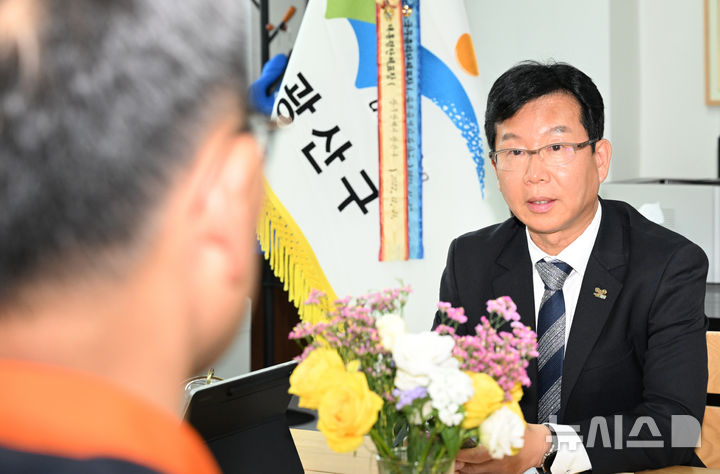 [광주=뉴시스] 김혜인 기자 = 28일 오후 광주 광산구청에서 전국금속노동조합 금호타이어 지회가 박병규 광산구청장과의 면담에서 '대형 화재에 따른 금호타이어 공장 구조 조정 가능성' 발언에 대해 사과를 요구하고 있다. 2025.05.28. [email protected]