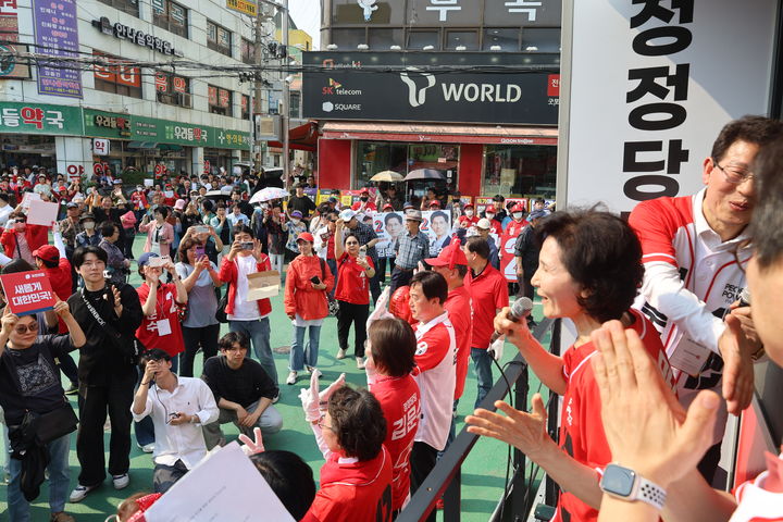 [서울=뉴시스] 고승민 기자 = 김문수 국민의힘 대선 후보 부인 설난영 여사가 28일 경기 의왕도깨비시장을 방문, 상인 및 시민에게 지지소를 호소하고 있다. (사진=국민의힘 제공) 2025.05.28. [email protected] *재판매 및 DB 금지