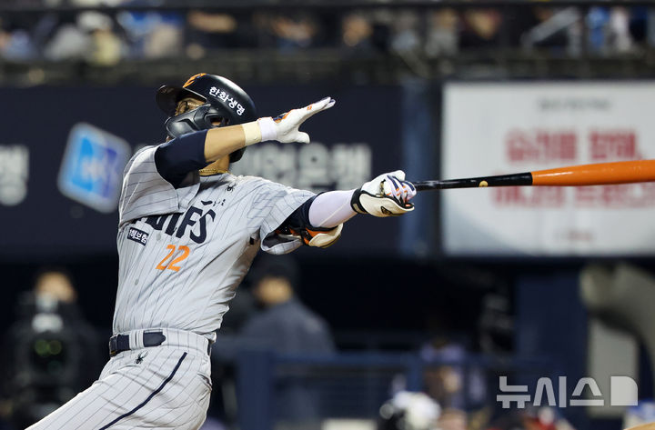 [서울=뉴시스] 김명년 기자 = 28일 서울 송파구 잠실야구장에서 열린 2025 KBO리그 한화 이글스와 LG 트윈스의 경기, 11회초 2사 주자 1루 상황 한화 채은성이 2점 홈런을 치고 있다. 2025.05.28. [email protected]