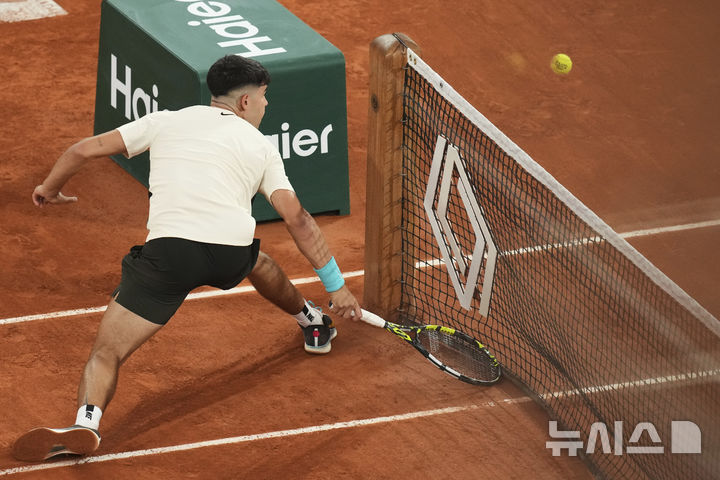 [파리=AP/뉴시스] 카를로스 알카라스(2위·스페인)가 28일(현지 시간) 프랑스 파리 롤랑가로스에서 열린 프랑스오픈 남자 단식 2회전에서 파비안 마로잔(56위·헝가리)을 상대로 드롭 샷을 구사하고 있다. 2연패를 노리는 알카라스가 3-1(6-1 4-6 6-1 6-2)로 이기고 3회전에 올랐다. 2025.05.29.