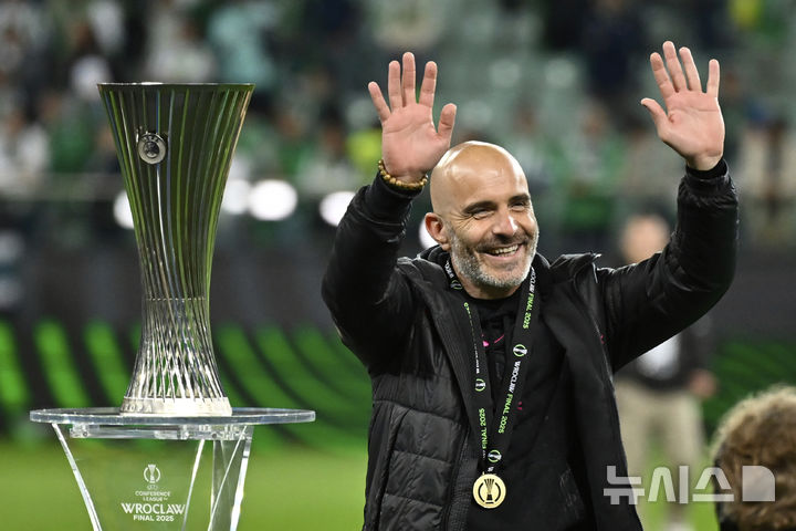 [브로츠와프=AP/뉴시스] 첼시의 엔초 마레스카 감독이 28일(현지 시간) 폴란드 브로츠와프의 스타디온 미에이스키에서 열린 2024-25 유럽축구연맹(UEFA) 유로파 콘퍼런스리그(UEL) 정상에 오른 후 트로피 옆에서 손을 흔들고 있다. 첼시는 결승전에서 레알 베티스(스페인)를 4-1로 꺾고 우승, UEFA가 주관한 모든 대회(챔피언스리그, 유로파리그, 슈퍼컵, 위너스컵, UECL) 우승컵을 거머쥔 최초의 팀이 됐다. 2025.05.29.