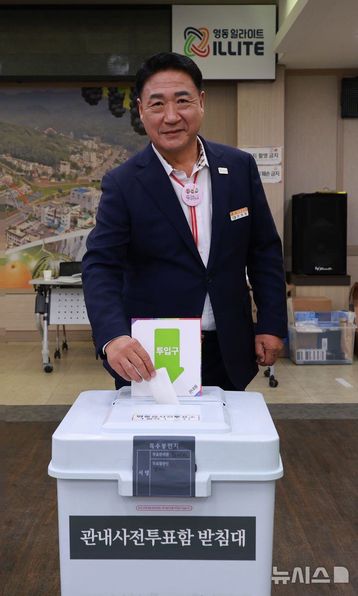 [영동=뉴시스] 21대 대선 사전투표 첫날인 29일 정영철 충북 영동군수가 영동읍사무소에 마련된 사전투표소에서 투표하고 있다. (사진=영동군 제공) 2025.05.29. [email protected]