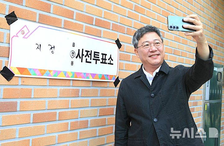 [원주=뉴시스] 이덕화 기자 = 국민의힘 원주갑 박정하 국회의원이 29일 오전 강원 원주시 서원주생활지원센터에 마련된 제21대 대통령선거 사전투표소에서 소중한 한표를 행사한 후 투표장 앞에서 셀프 사진을 촬영하고 있다. 2025.05.29. [email protected]