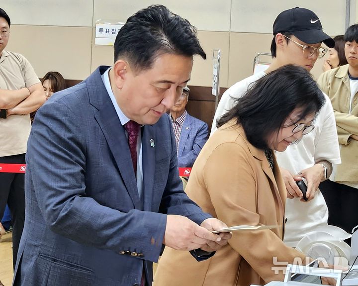 [청주=뉴시스] 이도근 기자= 김영환 충북지사가 29일 오전 충북 청주시 상당구 성안동 행정복지센터에 마련된 제21대 대통령 선거 사전투표소에서 투표지를 받고 있다. 2025.05.29. [email protected]