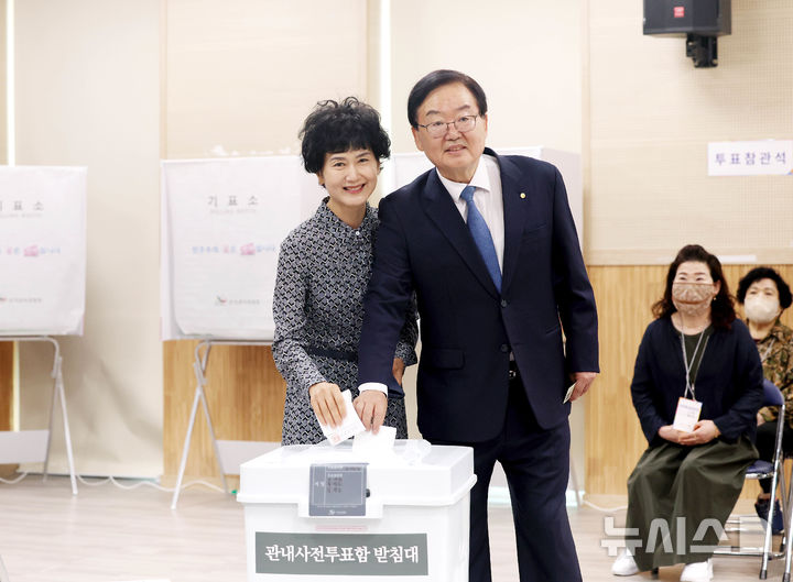 [광주=뉴시스] 박기웅 기자 = 제21대 대통령 선거 사전투표 첫날인 29일 오전 광주 북구 신용동 행정복지센터 사전투표소에서 문인 북구청장이 사전투표에 참여하고 있다. (사진 = 광주 북구 제공) 2025.05.29. [email protected]