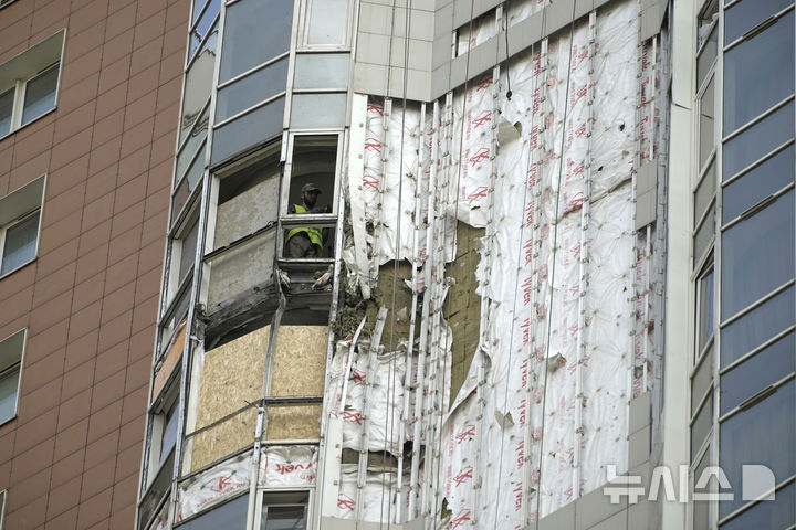 [모스크바=AP/뉴시스] 29일(현지 시간) 러시아 모스크바 베르나드스키 대로에 있는 미락스파크 주거단지 아파트 창문 사이로 시 근로자가 작업하고 있다. 이 아파트 단지는 우크라이나의 드론 공격으로 피해를 입은 것으로 전해졌다. 2025.05.29.