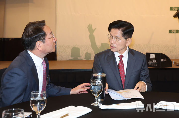 [인천=뉴시스] 전진환 기자 = 김문수 국민의힘 대선 후보가 29일 오전 인천시 연수구 쉐라톤 그랜드 인천호텔에서 열린 '제21대 대선후보 초청 새얼아침대화 강연회'에 참석해 유정복 인천시장과 대화하고 있다. 2025.05.29. [email protected]