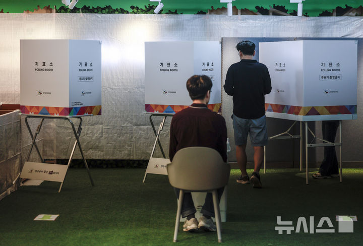 [서울=뉴시스] 정병혁 기자 = 제21대 대통령선거 사전투표 첫 날인 29일 서울 중구 동화동주민센터 내 작은도서관에 설치된 사전투표소에서 유권자들이 투표를 하고 있다. 2025.05.29. [email protected]