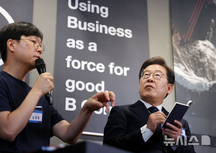 [서울=뉴시스] 조성우 기자 = 이재명 더불어민주당 대선후보가 29일 서울 성동구 메리히어에서 열린 '혁신성장의 씨앗, 스타트업 레벨업!' 간담회에서 소셜벤처 대표와 대화하고 있다. 2025.05.29. [email protected]