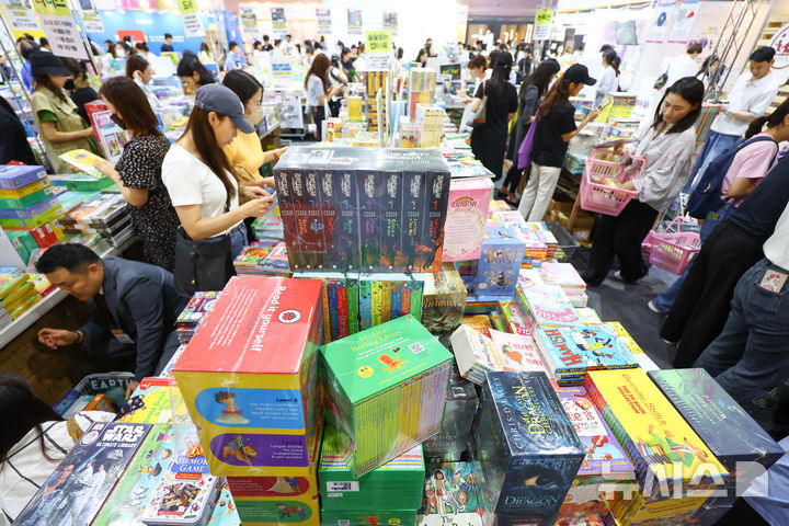 [서울=뉴시스] 황준선 기자 = 29일 서울 강남구 세텍(SETEC)에서 열린 서울국제유아교육전&키즈페어을 찾은 관람객들이 영어 동화책을 살펴보고 있다. 2025.05.29. [email protected]