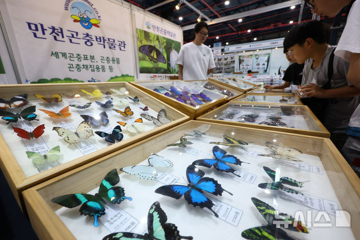[서울=뉴시스] 황준선 기자 = 29일 서울 강남구 세텍(SETEC)에서 열린 대한민국 곤충경진대회를 찾은 관람객들이 나비 박제를 살펴보고 있다. 2025.05.29. [email protected]