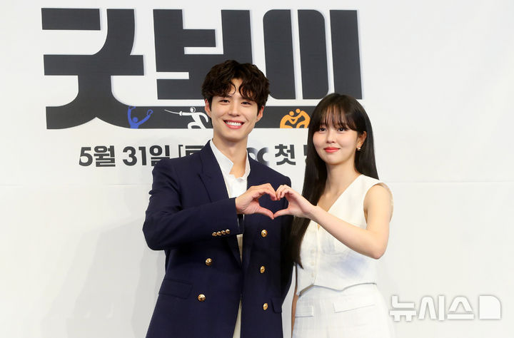 [서울=뉴시스] 김혜진 기자 = 배우 박보검(왼쪽), 김소현이 29일 오후 서울 구로구 신도림동 더 링크 서울 트리뷰트 포트폴리오 호텔에서 열린 JTBC 토일 드라마 '굿보이' 제작발표회에서 포즈를 취하고 있다. 2025.05.29. [email protected]