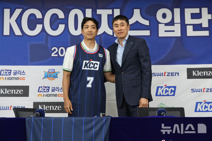 [서울=뉴시스] 김금보 기자 = 부산 KCC 이지스로 이적한 허훈이 29일 서울 강남구 KBL센터에서 열린 입단식에서 이상민 감독과 기념촬영을 하고 있다. 2025.05.29. [email protected]