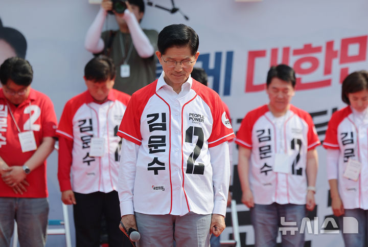 [안산=뉴시스] 권창회 기자 = 김문수 국민의힘 대선 후보가 29일 경기 안산시 안산문화광장에서 열린 유세 시작에 앞서  경북 포항에서 발생한 해군 소속 해상초계기 추락 사고 희생자에 대한 묵념을 하고 있다. (공동취재) 2025.05.29. [email protected]