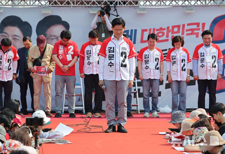 [안산=뉴시스] 권창회 기자 = 김문수 국민의힘 대선 후보가 29일 경기 안산시 안산문화광장에서 열린 유세 시작에 앞서 경북 포항에서 발생한 해군 소속 해상초계기 추락 사고 희생자에 대한 묵념을 하고 있다. (공동취재) 2025.05.29. [email protected]