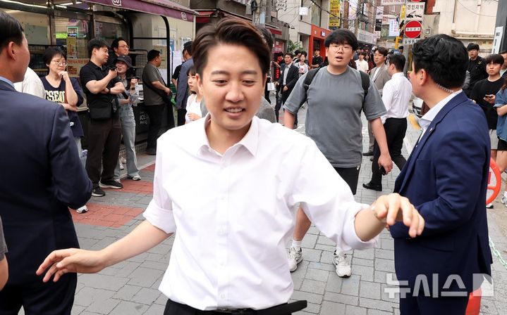 [서울=뉴시스] 조성봉 기자 = 이준석 개혁신당 대선후보가 29일 서울 성북구 고려대 정경대 후문에서 유세를 마치고 인증샷을 찍고 있는 가운데 대학생이(뒤) 이 후보가 TV토론 당시 여성 신체 부위 언급 것 등에 대해 항의를 하고 있다. 2025.05.29. [email protected]