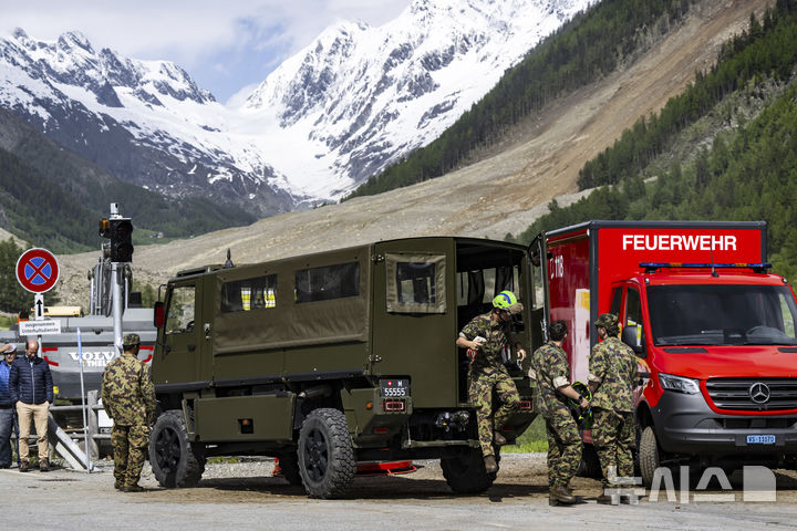 [빌러=AP/뉴시스] 29일(현지 시간) 스위스 발레주 뢰첸탈 계곡의 블라텐 마을 상당 부분이 대규모 산사태로 매몰된 가운데 스위스 군인들이 수색과 복구를 위해 인근 빌러 마을에 도착하고 있다. 2025.05.30.