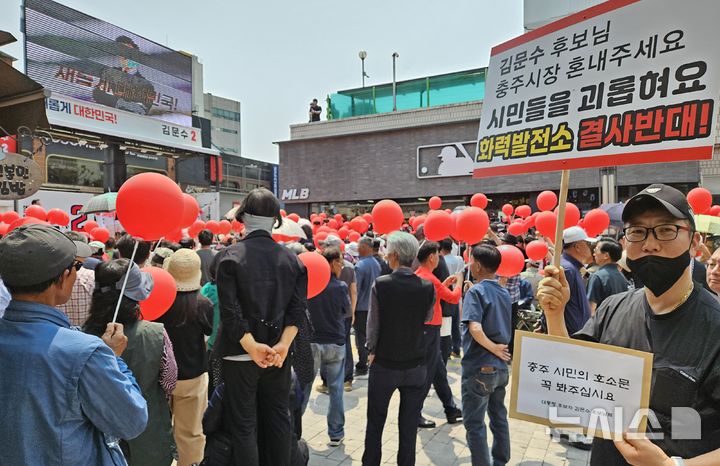 [충주=뉴시스] 이병찬 기자 = 30일 충북 충주시의 LNG발전소 건립 추진에 반발한 지역 주민들이 국민의힘 김문수 대선 후보 유세장에서 피켓 시위를 하고 있다[email protected]