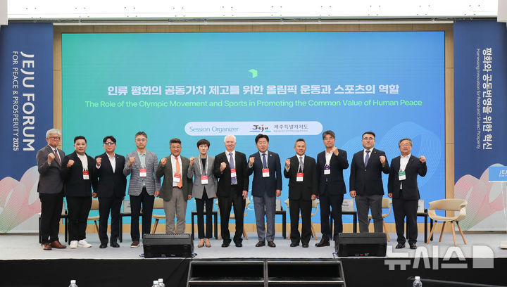 [서귀포=뉴시스] 우장호 기자 = 30일 제주 서귀포시 중문동 제주국제컨벤션센터에서 열린 '제20회 평화와 번영을 위한 제주포럼' 내 제주도 세션 '인류 평화의 공동가치 제고를 위한 올림픽 운동과 스포츠의 역할' 시작에 앞서 오영훈(오른쪽 다섯번째) 제주지사와 현정화(왼쪽 여섯번째) 대한탁구협회 수석부회장(한국마사회 감독) 등 관계자들이 기념촬영 하고 있다. 2025.05.30. [email protected]