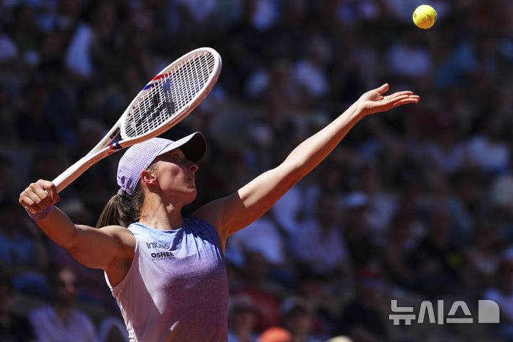 [파리=AP/뉴시스] 이가 시비옹테크(5위·폴란드)가 30일(현지 시간) 프랑스 파리 롤랑가로스 스타디움에서 열린 프랑스오픈 여자 단식 3회전에서 재클린 크리스티안(60위·루마니아)과 경기하고 있다. 4연패를 노리는 시비옹테크가 2-0(6-2 7-5)으로 이기고 16강에 올라 엘레나 리바키나(11위·카자흐스탄)와 맞붙는다. 2025.05.31.