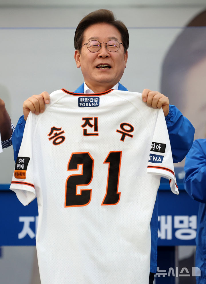 [대전=뉴시스] 조성우 기자 = 이재명 더불어민주당 대선후보가 31일 오후 대전 서구 대전시청 앞 보라매공원에서 열린 유세에서 송진우 전 한화이글수 투수가 전달한 유니폼을 들어 보이고 있다. 2025.05.31. [email protected]