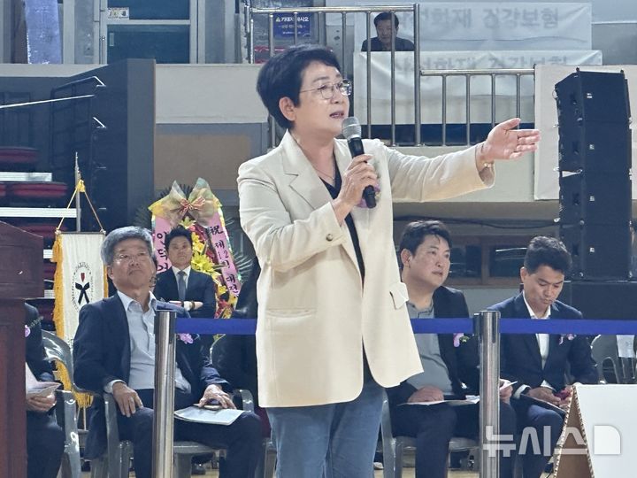 [대전=뉴시스] 김도현 기자 = 1일 오전 대전 중구 부사동 충무체육관에서 대전시체조협회와 뉴시스 대전충남본부가 공동 주최·주관한 제12회 대전생활체조경연대회가 열린 가운데 더불어민주당 소속 박정현 국회의원이 축사를 하고 있다. 2025.06.01. [email protected]