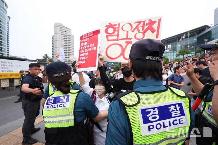[서울=뉴시스] 조성봉 기자 = 1일 오후 서울 중구 서울역광장에서 열린 이준석 개혁신당 대선후보의 유세에서 시민들이 이 후보를 규탄하는 시위를 하자 경찰이 제지하고 있다.2025.06.01. [email protected]