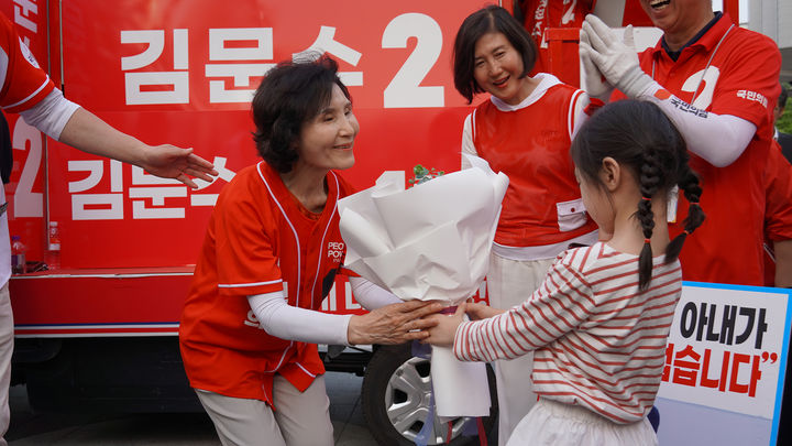 [서울=뉴시스] 조성봉 기자 = 김문수 국민의힘 대선후보의 배우자인 설난영 여사가 1일 세종시 제천뜰근린공원에서 열린 지원 유세에서 어린이에게 꽃다발을 전달받고 있다.(사진=국민의힘 제공)2025.06.01. [email protected]