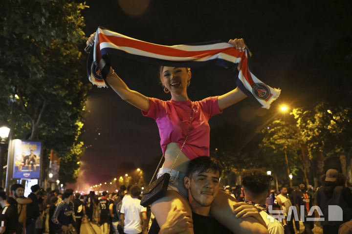 [파리=AP/뉴시스] = 1일(현지 시간) 유럽축구연맹(UEFA) 챔피언스리그(UCL) 결승전에서 파리 생제르맹이 우승을 차지 한 뒤 프랑스 파리 샹젤리제 거리에서 응원단이 기뻐하고 있다. 2025.06.02. [email protected]