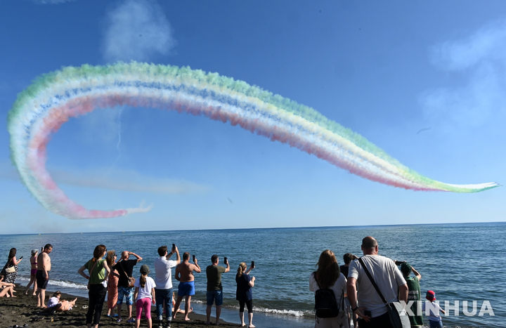 [로마=신화/뉴시스] = 1일(현지 시간) 이탈리아 로마 라디스폴리에서 열린 에어쇼에서 이탈리아 이탈리아 공군 소속 공중 곡예 비행단 프레체 트리콜로리가 에어쇼를 선보이고 있다. 2025.06.02.
