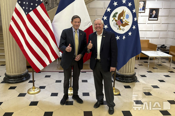 [파리=AP/뉴시스]리처드 블루멘탈원(왼쪽, 민주)과 린지 그레이엄(공화) 상원의원이 1일 파리주재 미 대사관에서 기자들과 만나면서 엄지손가락을 치켜들고 있다. 이들은 블라디미르 푸틴 러시아 대통령이 우크라이나에 대한 새 공격을 준비하면서 평화협상을 교착 상태에 빠지게 했다며, 앞으로 2주 동안에 우크라이나 전쟁의 미래가 결정될 수도 있다고 주장했다. 2025.06.02.
