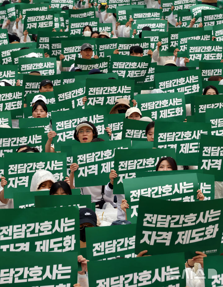 [세종=뉴시스] 강종민 기자 = 대한간호협회와 간호대생 등이 2일 세종시 정부세종청사 보건복지부 앞에서 진료지원업무 수행하는 간호사교육 및자격관리 투명화와 법제화 촉구대회를 하고 있다. 2025.06.02. [email protected]