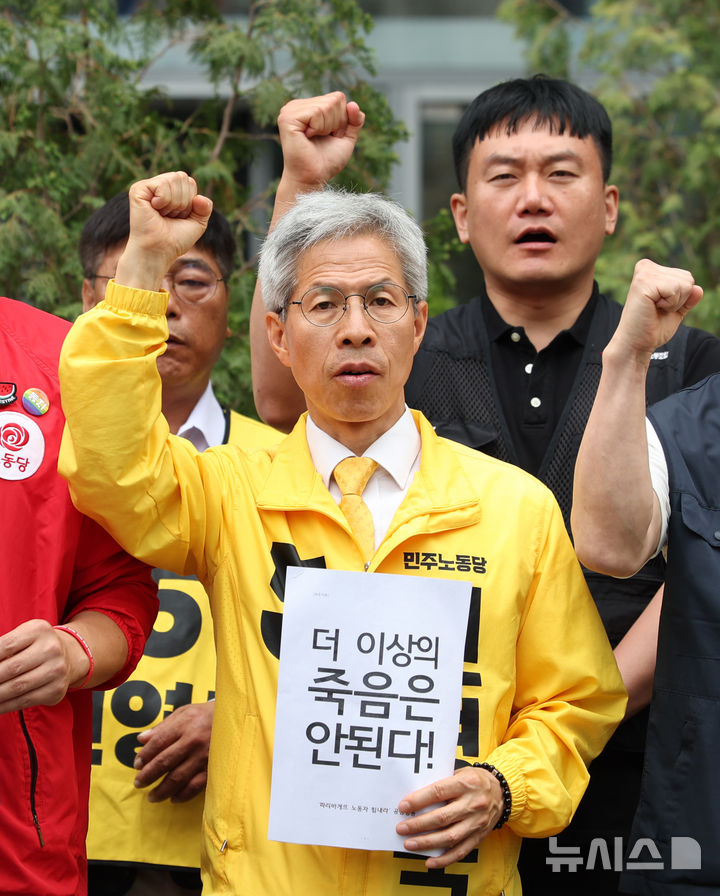 [서울=뉴시스] 김금보 기자 = 권영국 민주노동당 대선후보가 2일 서울 서초구 에스피씨 지에프에스 본사 앞에서 열린 '반복되는 SPC 중대재해, 책임자 처벌과 근본 대책 마련 촉구 기자회견'에서 구호를 외치고 있다. 2025.06.02. [email protected]