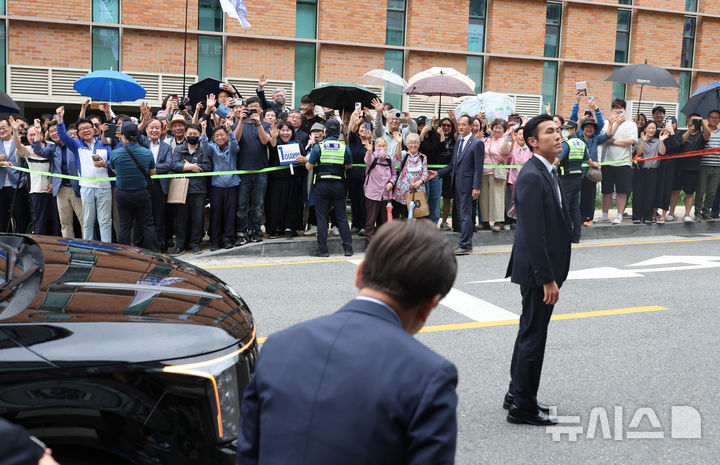 [성남=뉴시스] 고승민 기자 = 이재명 더불어민주당 대선 후보가 2일 경기 성남주민교회에서 기자회견을 하기 전 성남시의료원 앞서 기다리고 있는 시민들을 향해 인사하고 있다. 2025.06.02. [email protected]