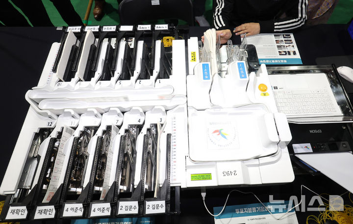 [인천=뉴시스] 전진환 기자 = 제21대 대통령 선거를 하루 앞둔 2일 오후 인천 부평구 삼산월드체육관에 설치된 개표소에서 개표사무원이 투표지분류기 모의시험을 하고 있다. 2025.06.02. [email protected]