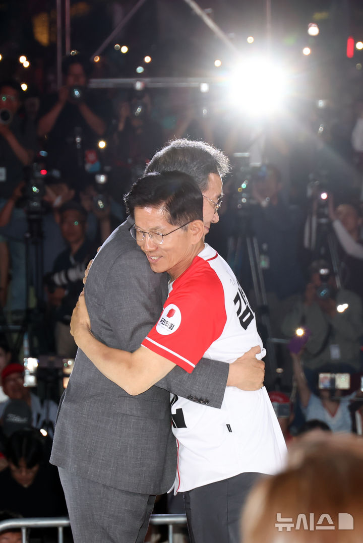 [서울=뉴시스] 고승민 기자 = 김문수 국민의힘 대통령 후보가 제21대 대통령 선거를 하루 앞둔 2일 오후 서울 중구 서울시청 앞 광장에서 열린 '울려라 함성, 들어라 승리의 메아리' 피날레 유세에서 이낙연 전 국무총리와 포옹하고 있다. 2025.06.02. [email protected]