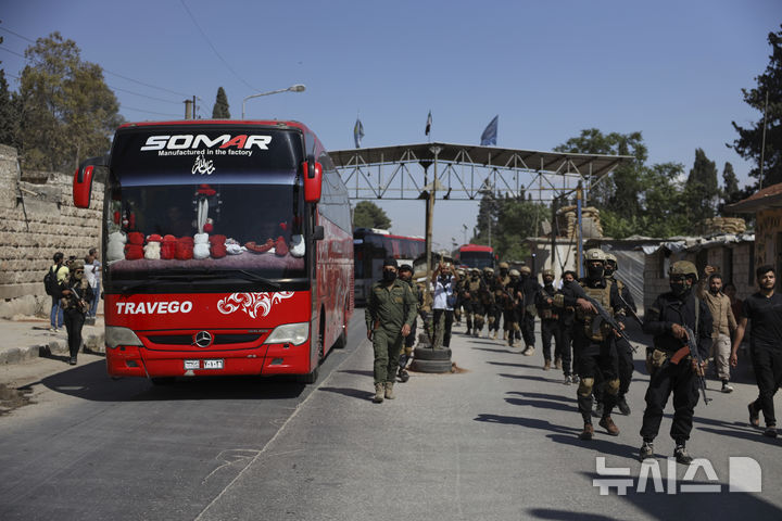 [알레포=AP/뉴시스] 2일(현지 시간) 시리아 알레포에서 시리아 과도정부와 쿠르드 주도 시리아민주군(SDF) 간 포로 교환이 진행되는 가운데, 정부 보안군 요원들이 석방 포로들이 타고 있는 버스를 호위하고 있다. 이날 양측은 올해 초 체결된 합의에 따라 총 470명의 포로를 교환한 것으로 전해졌다. 2025.06.03.