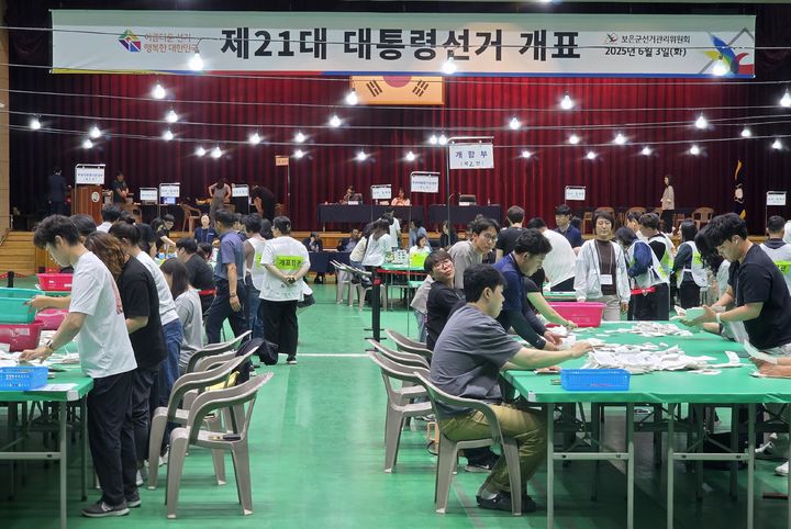 [보은=뉴시스] 21대 대통령선거 투표가 끝난 3일 오후 늦은 시각 충북 보은군 보은국민체육센터에 설치한 개표장에서 개표사무원들이 투표함을 개봉하고, 후보자별 득표수를 집계하고 있다. (사진=독자 제공) 2025.06.03. [email protected]