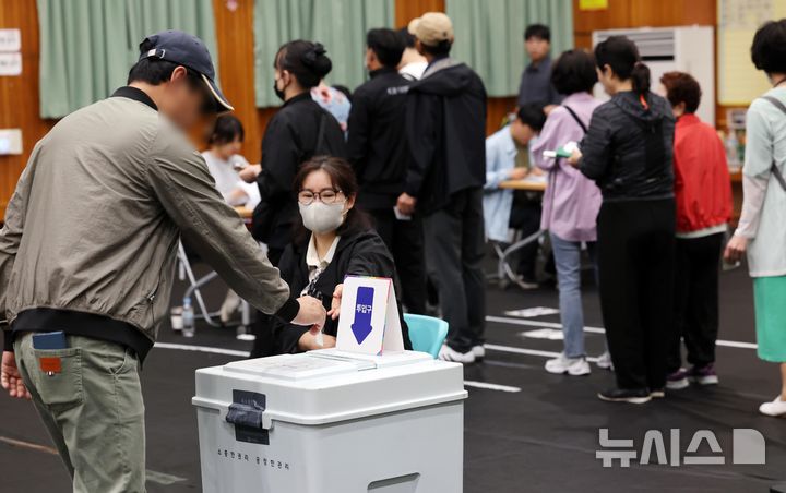 [부산=뉴시스] 하경민 기자 = 제21대 대통령 선거일인 3일 부산 동래구 내성초등학교 체육관에 마련된 복산동 제2투표소에서 유권자들이 소중한 한 표를 행사하고 있다. 2025.06.03. [email protected]