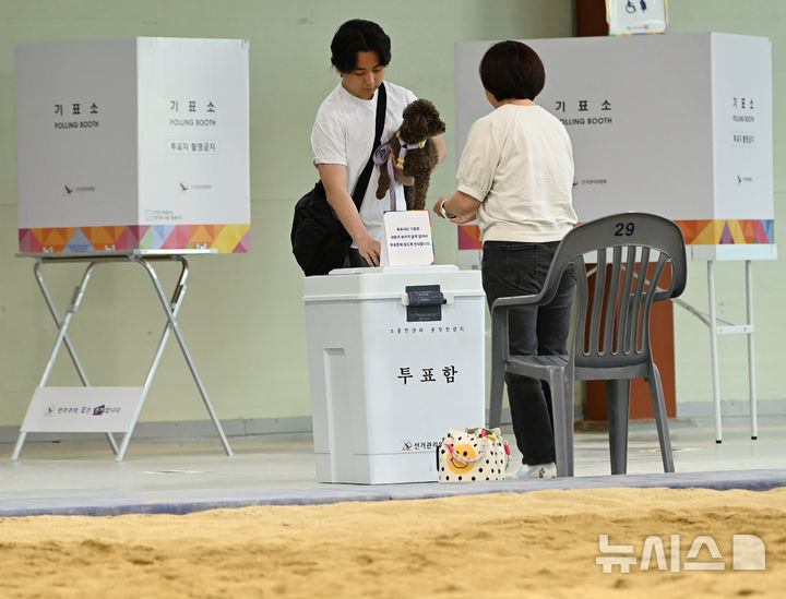 [성남=뉴시스] 김종택 기자 = 제21대 대통령선거일인 3일 경기 성남시 중원구 성남종합운동장 실내씨름장에 마련된 성남동 제2투표소에서 유권자들이 투표하고 있다. 2025.06.03. [email protected]