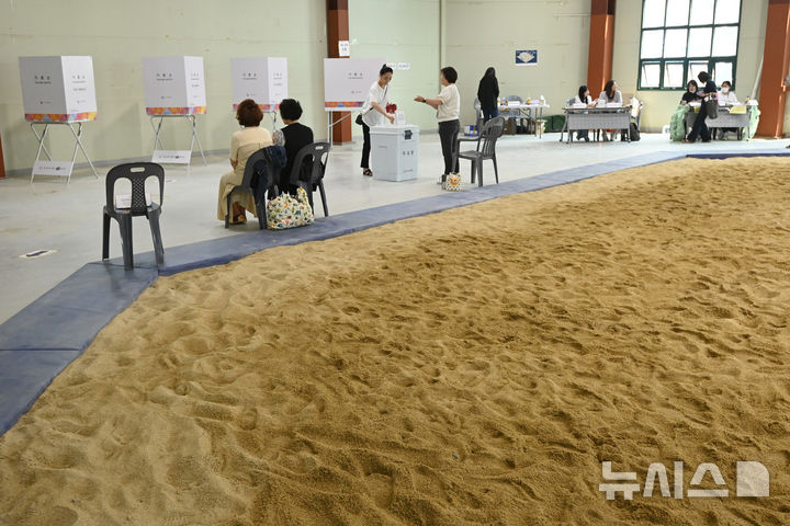 [성남=뉴시스] 김종택 기자 = 제21대 대통령선거일인 3일 경기 성남시 중원구 성남종합운동장 실내씨름장에 마련된 성남동 제2투표소에서 유권자들이 투표하고 있다. 2025.06.03. [email protected]