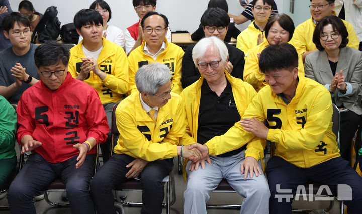 [서울=뉴시스] 김진아 기자 = 권영국 민주노동당 대선 후보가 3일 서울 구로구 민주노동당사에 마련된 선거캠프에서 제21대 대통령 선거 출구조사 결과 발표 후 인사를 나누고 있다. 2025.06.03. [email protected]