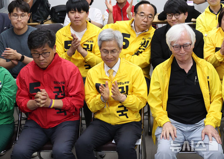 [서울=뉴시스] 김진아 기자 = 권영국 민주노동당 대선 후보가 3일 서울 구로구 민주노동당사에 마련된 선거캠프에서 제21대 대통령 선거 출구조사 결과 발표 후 박수치고 있다. 2025.06.03. [email protected]