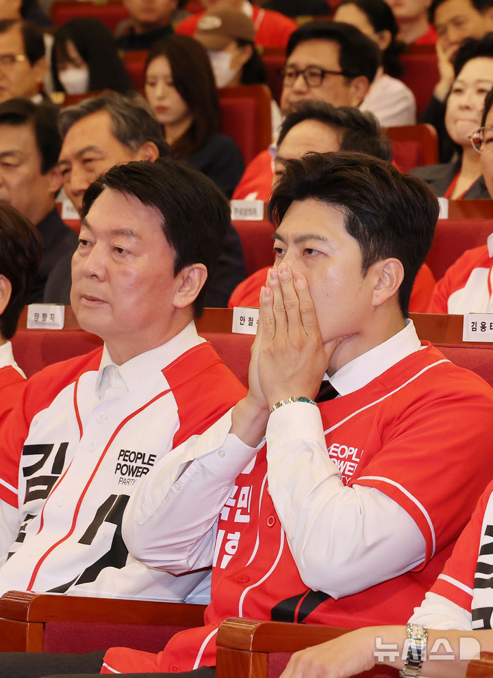 [서울=뉴시스] 고승민 기자 = 김용태 국민의힘 비상대책위원장이 3일 서울 여의도 국회도서관에 마련된 국민의힘 제21대 대통령선거 개표상황실에서 방송사 출구조사 결과를 지켜보고 있다. (공동취재) 2025.06.03. [email protected]