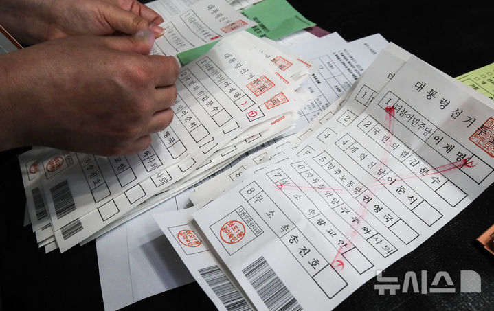 [제주=뉴시스] 우장호 기자 = 제21대 대통령 선거가 종료된 3일 오후 제주시 한라체육관에 마련된 개표소에서 선거사무원이 무효표를 선별하고 있다. 2025.06.03. [email protected]