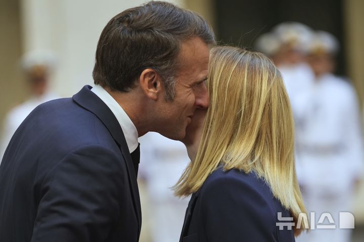 [로마=AP/뉴시스] 에마뉘엘 마크롱(왼쪽) 프랑스 대통령과 조르자 멜로니 이탈리아 총리가 3일(현지 시간) 이탈리아 로마 치기궁 앞에서 만나 인사를 나누고 있다. 2025.06.04.