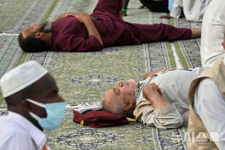 [메카=AP/뉴시스] 3일(현지 시간) 사우디아라비아 메카의 그랜드 모스크(마스지드 알하람)에서 연례 성지순례(하지)를 앞둔 무슬림 순례자들이 낮잠을 자고 있다. 이슬람 최고 성지인 사우디 메카와 메디나에서 4일부터 하지가 시작돼 9일까지 이어진다. 하지는 무슬림이 반드시 행해야 할 5대 의무 중 하나다. 2025.06.04.